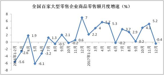 12月份,在同期增速基数较高的影响下,全国百家大型百家重点大型零售企业零售额同比下降0.4%,增速较2016年同期放缓7.4个百分点,较11月份放缓5.6个百分点。