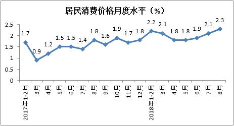 1-8月份,居民消费价格同比上涨2%,涨幅较2017年同期提高0.5个百分点。其中食品价格同比上涨1.2%,涨幅较2017年同期加快2.9个百分点;非食品价格同比上涨2.2%,涨幅较同期放缓0.1个百分点。消费品价格同比上涨1.6%,涨幅较同期提高1个百分点;服务价格同比上涨2.7%,涨幅较上年同期放缓0.2个百分点。