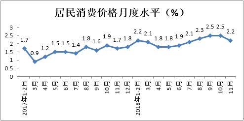 1-11月份,居民消费价格累计上涨2.1%,涨幅较2017年同期提高0.6个百分点。其中食品价格同比上涨1.7%,涨幅较2017年同期加快3.2个百分点;非食品价格同比上涨2.2%,涨幅较同期放缓0.1个百分点。消费品价格同比上涨1.9%,涨幅较同期提高1.2个百分点;服务价格同比上涨2.5%,涨幅较上年同期放缓0.5个百分点。