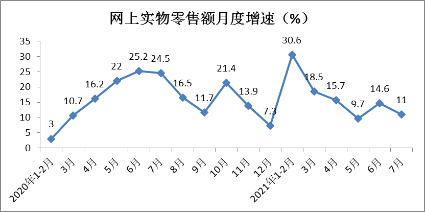 1-7月份,实物商品网上零售额实现58130亿元,同比增长17.6%,增速较1-6月份放缓1.1个百分点。1-7月份,实物商品网上零售额占社会消费品零售总额的比重为23.6%,占比较1-6月份下降0.1个百分点。其中,吃类、穿类和用类商品分别增长23.7%、21.6%和15.8%。经测算,7月份实物商品网上零售额实现7867亿元,同比增长11%,增速环比放缓3.6个百分点。