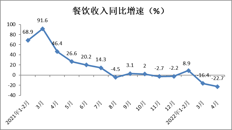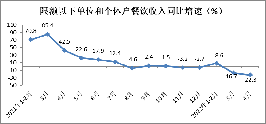 1-4月份,餐饮收入13262亿元,同比下降5.1%,增速较一季度回落5.6个百分点。4月份,餐饮收入同比大幅下降22.7%,降幅较上月扩大6.3个百分点。