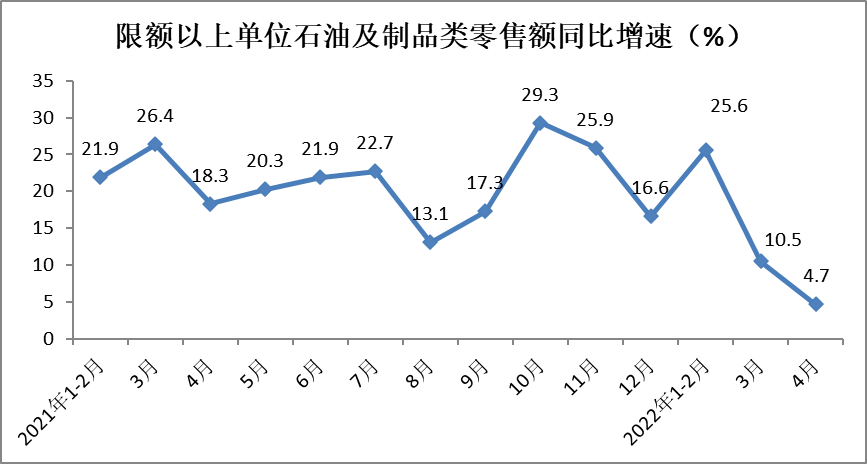 1-4月份,限额以上单位石油及制品类零售额实现7131亿元,同比增长15.7%,增速较一季度放缓4个百分点。其中,4月份同比增长4.7%,增速较上月放缓5.8个百分点。