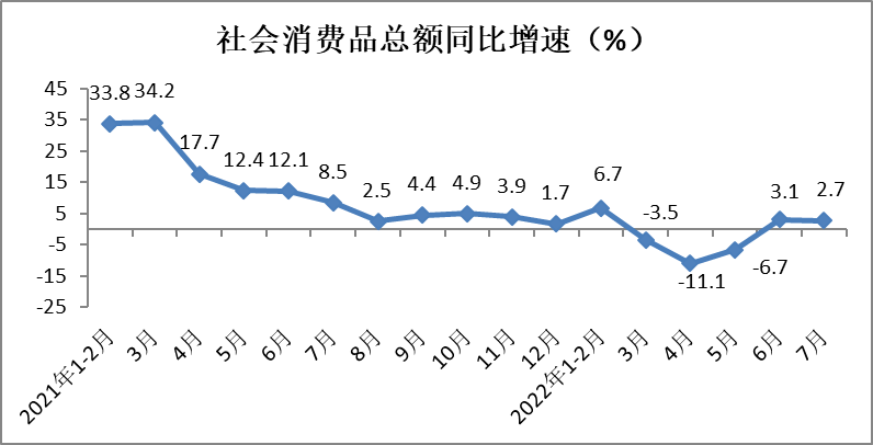 1-7月份,社会消费品零售总额实现246302亿元,同比下降0.2%,降幅较上半年收窄0.5个百分点。7月份,社会消费品零售总额实现35870亿元,同比增长2.7%,增幅较6月份放缓0.4个百分点。