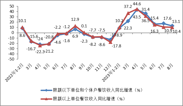 经测算,8月份限额以下单位和个体户餐饮收入同比增长13.1%,增速较7月份放缓4.5个百分点。1-8月份,限额以下单位和个体户餐饮收入实现24308亿元,同比增长19.3%,增速较1-7月份放缓0.9个百分点。