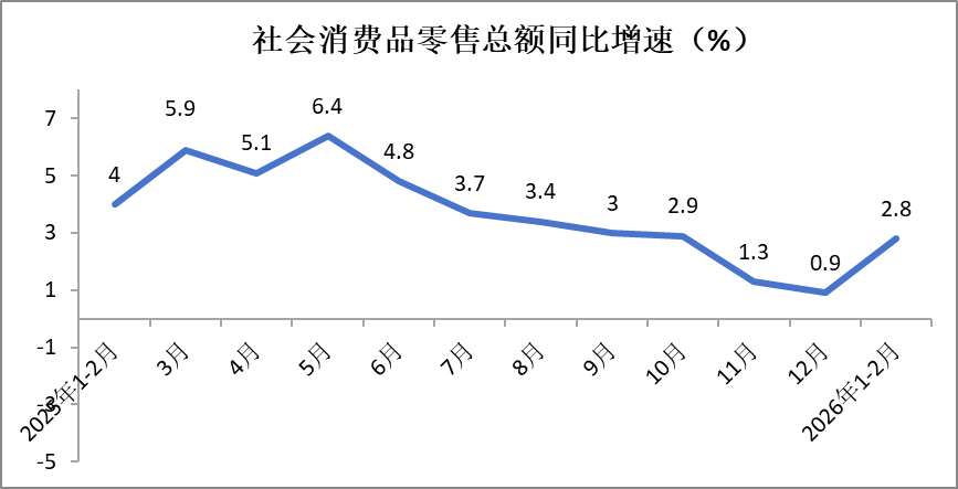 2026年1-2月份,商品零售额75815亿元,同比增长2.5%,增速较上年12月份加快1.8个百分点。其中,限额以上单位商品零售额29405亿元,同比增长2.5%,增速相比上年12月加快4.5个百分点。