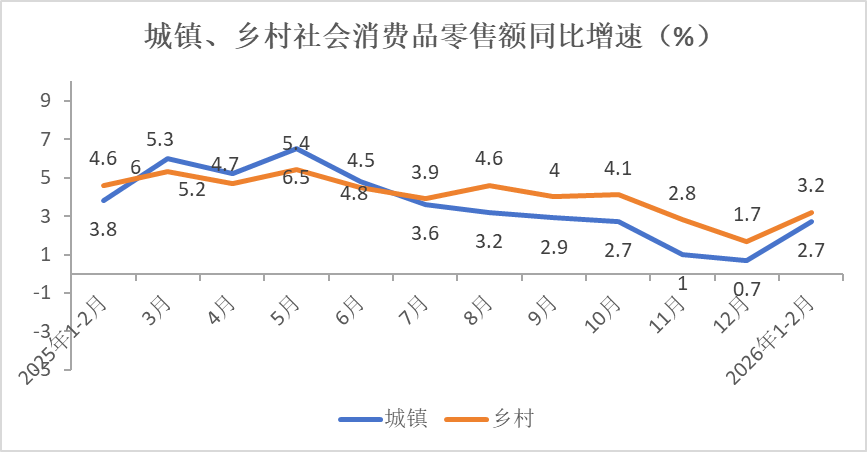 1-2月份,城镇消费品零售额74449亿元,同比增长2.7%,增速较上年12月份加快2.0个百分点;乡村消费品零售额11630亿元,增长3.2%,增速较上年12月份加快1.5个百分点。乡村消费品零售额增速快于城镇0.5个百分点。乡村全面振兴扎实推进,县乡地区商业体系持续完善,包含镇区和乡村的县乡消费品零售额占社会消费品零售总额的比重为38.5%,比上年同期提高0.1个百分点。