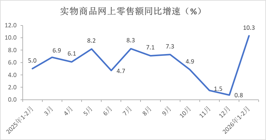 随着居民消费品质稳步提升,加之春节假日消费带动,2026年1-2月多数商品类别实现增长。基本生活类商品中,限额以上单位服装鞋帽针纺织品类、粮油食品类和日用品类分别同比增长10.4%、10.2%、6.6%;发展型、改善型需求相关商品销售较快增长,其中,限额以上单位金银珠宝类、化妆品类和体育娱乐用品类分别同比增长13.0%、4.5%和4.1%。消费品以旧换新政策效应继续显现,限额以上单位通讯器材类、家具类、文化办公用品类、家用电器和音像器材类分别同比增长17.8%、8.8%、5.8%和3.3%。