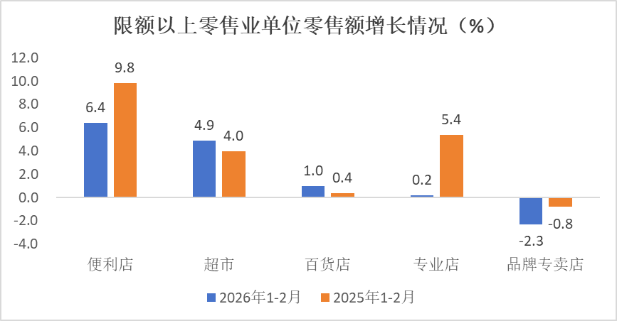 按零售业态分,1-2月,限额以上零售业单位中便利店、超市、百货店、专业店零售额同比分别增长6.4%、4.9%、1.0%、0.2%;品牌专卖店零售额下降2.3%。