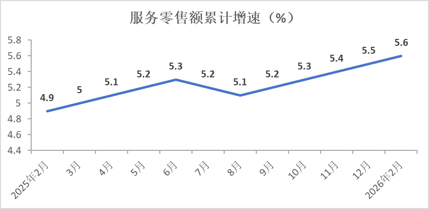 随着扩大服务消费政策持续发力显效,服务消费市场保持较快增长。2026年1-2月份,服务零售额同比增长5.6%,增速比上年全年加快0.1个百分点,高于同期商品零售额3.1个百分点,网上服务零售额同比增长7.3%,快于全部服务零售额增长。在春节假期带动下,旅游、休闲、餐饮等相关服务销售扩大。前2个月,旅游咨询租赁服务类、文体休闲服务类零售额均保持10%以上较快增长。有关部门数据显示,春节假期,国内出游接近6亿人次,出游总花费超过8000亿元,全国铁路累计发送旅客1.21亿人次,同比增长11.5%。国家电影局数据显示,春节档电影票房为57.52亿元,观影人次为1.20亿。