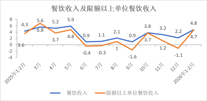 2026年1-2月餐饮收入10264亿元,同比增长4.8%,增速比上年12月份、上年全年分别加快2.6、1.6个百分点。其中,限额以上单位餐饮收入2813亿元,同比增长4.7%,增速较上年全年12月份、上年全年分别加快5.8、2.7个百分点。
