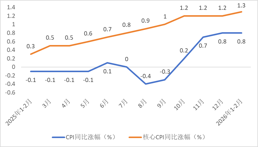1-2月份,全国居民消费价格(CPI)同比上涨0.8%。其中,食品价格同比上涨0.5%,非食品价格同比上涨0.8%;消费品价格同比上涨0.7%,服务价格同比上涨0.8%;扣除食品和能源的核心CPI同比上涨1.3%。2月份,居民消费价格同比上涨1.3%,为近三年来最高,有以下影响因素:一是服务价格涨幅明显扩大,上涨1.6%,影响CPI同比上涨约0.75个百分点。飞机票、交通工具租赁、车辆修理与保养价格同比分别上涨29.1%、19.8%、12%;二是食品价格由降转升。2月份食品价格同比上涨1.7%,影响CPI同比上涨约0.30个百分点。其中,鲜菜、牛肉、羊肉和鲜果价格涨幅在5.9%—10.9%之间,合计影响CPI同比上涨约0.41个百分点;三是工业消费品价格涨幅扩大,同比上涨1.1%,涨幅比上月扩大0.2个百分点。