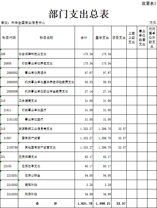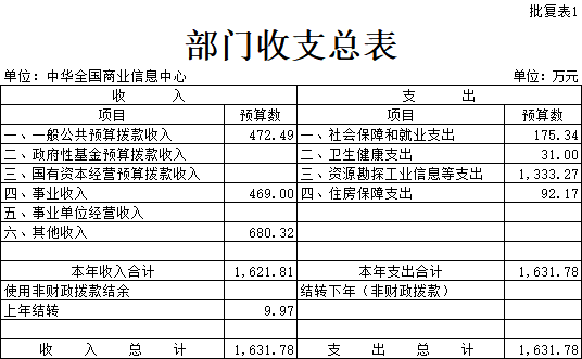 按照综合预算的原则,中华全国商业信息中心所有收入和支出均纳入部门预算管理。收入包括:一般公共预算拨款收入、事业收入、其他收入、上年结转等;支出包括:社会保障和就业支出、资源勘探工业信息等支出、住房保障支出等。中华全国商业信息中心收支总预算1631.78万元。
