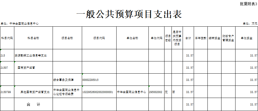 2026年,中华全国商业信息中心一般公共预算项目支出总额33.57万元,均为中华全国商业信息中心论坛专项经费预算。